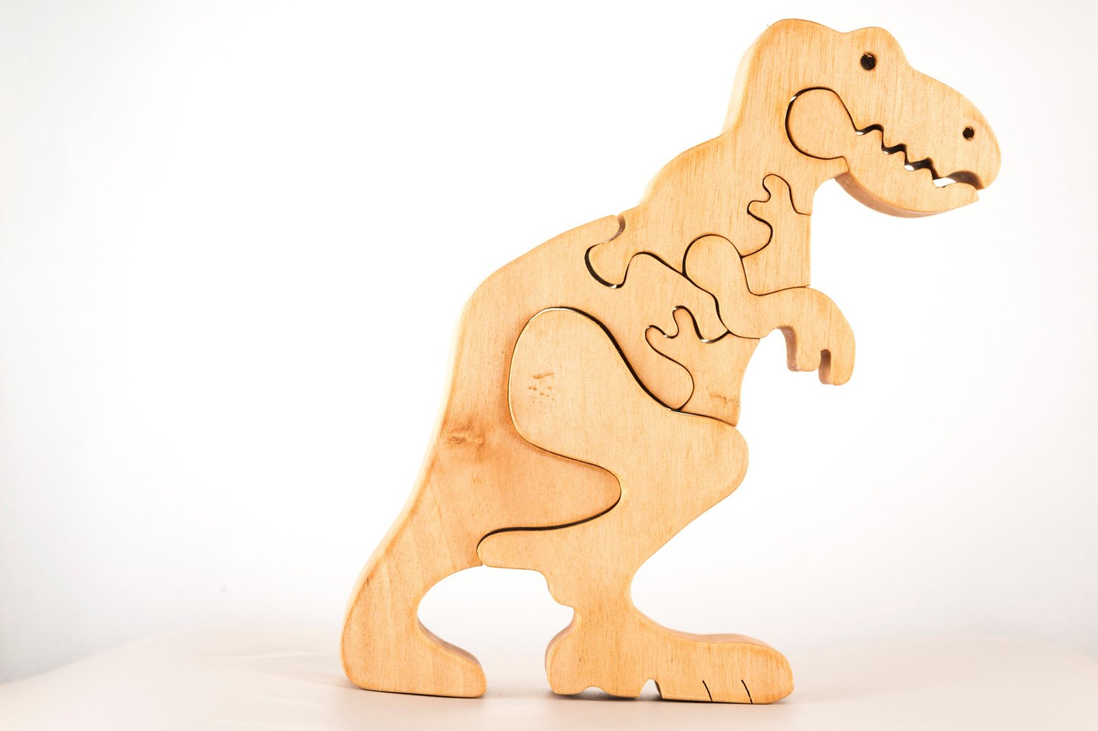 este rompecabezas familiar de madera representa un T-Rex en pose imponente. Ideal como pieza decorativa o juguete simbólico para amantes de los dinosaurios. Cada pieza encaja con armonía y simboliza la conexión entre miembros de una familia.