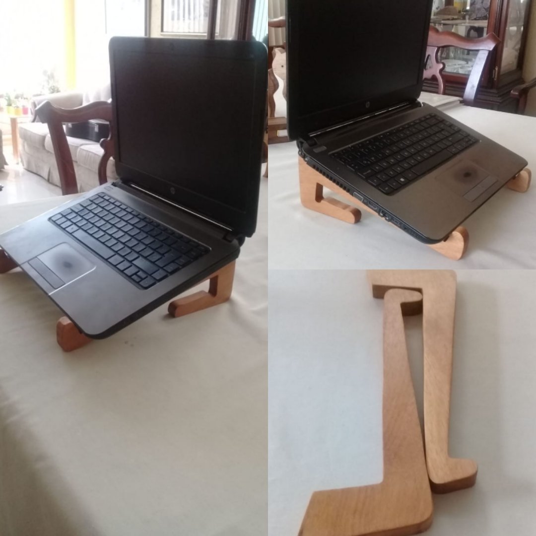 Base inclinada artesanal para laptops, ergonómica y decorativa.